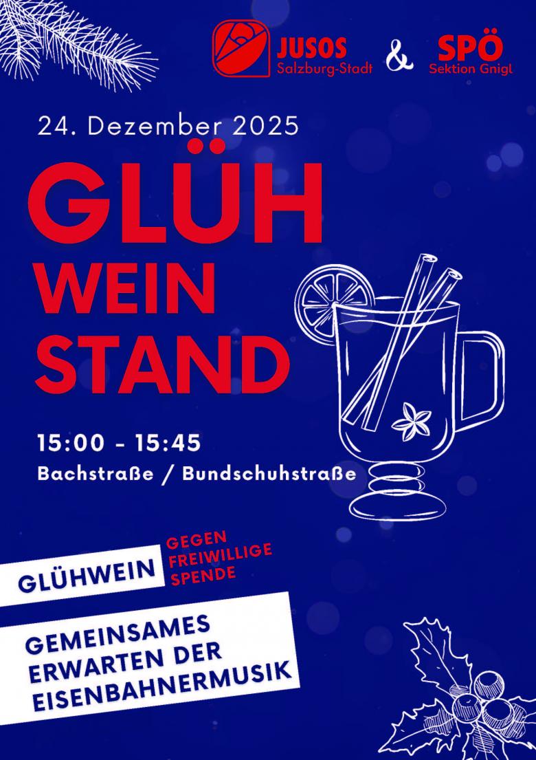 Am 24.12.2025 laden die Jusos Salzburg Stadt gemeinsam mit der SPÖ Sektion Gnigl zum Glühweinstand in Gnigl ein. In gemütlicher Atmosphäre wollen wir gemeinsam den Heiligen Abend einläuten und auf das Eintreffen der Eisenbahnermusik warten.